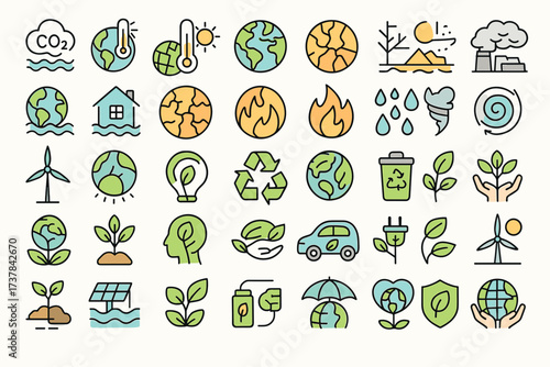 Colorful Ecology and Climate Change Icons Set – Environment and Sustainability Concept