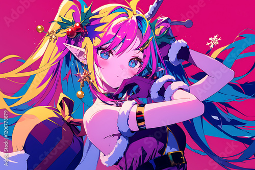 Colorful elf character with vibrant hair and festive accessories posing against a bright pink backdrop