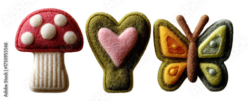 Colorful Felt-Style Mushroom, Heart, and Butterfly on Transparent Background