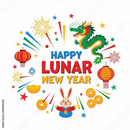 Colorful Festive Lunar New Year Celebration Illustration with Dragon, Rabbit, Lanterns, Fireworks, and Traditional Prosperity Symbols