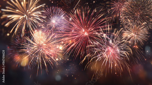 Colorful fireworks burst against a dark sky, illuminating the night with vibrant sparks and trails, creating a festive atmosphere.