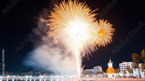 Colorful fireworks illuminate a night sky over a waterfront scene.