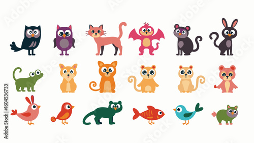 Colorful flat vector cartoon animal silhouettes collection – cute wild, domestic, aquatic, jungle, fantasy, and forest animals in minimalist kid-friendly style on white background