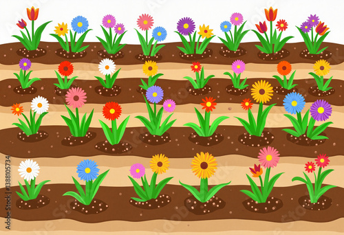 Colorful flower bed with fresh blooms in neat rows, garden beauty