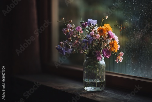 Colorful Flower Bouquet in Glass Jar on Windowsill with Rainy Window Scene
