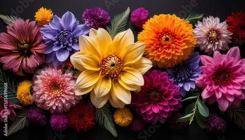 colorful flowers arranged on a black background creating a striking visual contrast