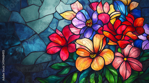 Colorful flowers in stained glass background wallpaper