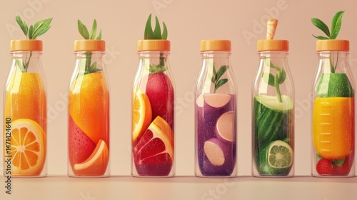 Colorful Fruit and Vegetable Juices in Glass Bottles Still Life Studio Shot Healthy Lifestyle Concept