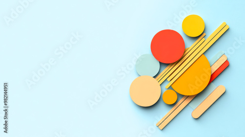 Colorful geometric shapes arranged creatively on a soft blue background, perfect for design, art, or craft projects.
