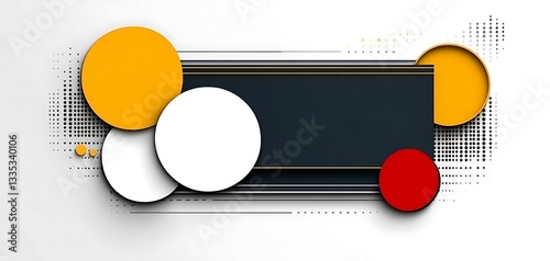 Colorful geometric shapes with halftone patterns and dark rectangle banner