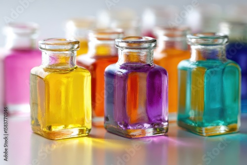 Colorful glass bottles filled with vibrant liquids showcasing an artistic display at a creative workshop during a sunny afternoon