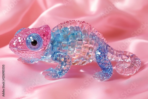 Colorful glass chameleon figure rests on soft satin fabric in vibrant pastel shades