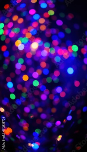 Colorful glowing lights create festive, vibrant abstract background perfect for holiday celebrations. Circular bokeh patterns in various vibrant hues fill image. Dynamic, colorful background evokes