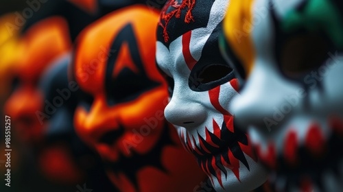 Colorful Halloween masks featuring skull designs and vibrant patterns for festive decoration and spooky celebrations.