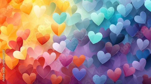 Colorful hearts bokeh background for Valentine's Day in pastel colors, horizontal greeting card with copy space for text