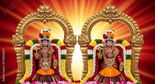 Colorful Hindu Deities Decorated with Flowers in Ornate Gold Frames for Religious Festival