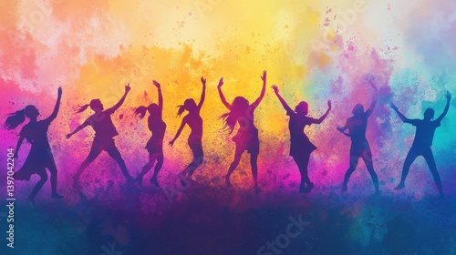 colorful holi festival celebration with silhouettes of people dancing and throwing colors in the air illustration