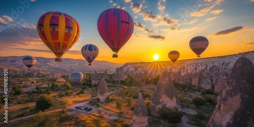 Colorful hot air balloons soar over a stunning desert landscape at sunset. created by ai
