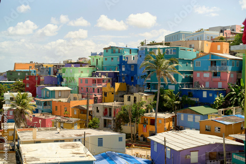 Colorful houses tightly packed on a hill in a tropical urban landscape under a blue sky with fluffy clouds.