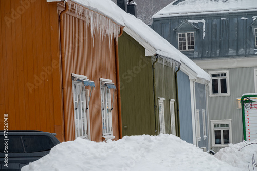 Colorful Houses with Icicles in Rjukan's Winter Street