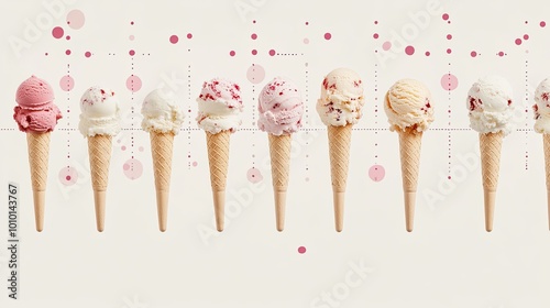 Colorful Ice Cream Cones in a Row on Creamy Background