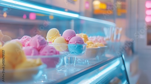 Colorful Ice Cream Scoops in Glass Bowls Displayed