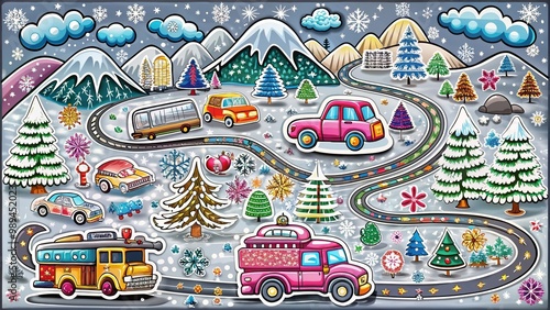 Colorful illustration depicting a winter scene with various vehicles traveling through a snowy landscape