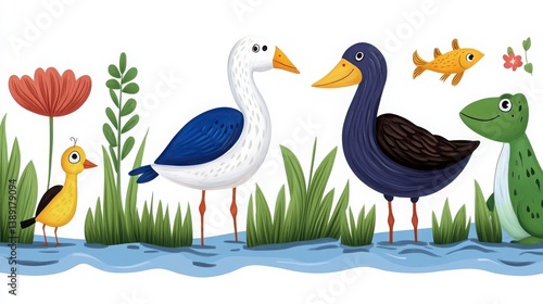 Colorful Illustration of Cartoon Birds and Animals by the Water