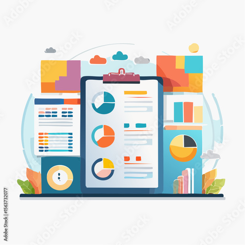 Colorful illustration of data analysis and business statistics charts and diagrams