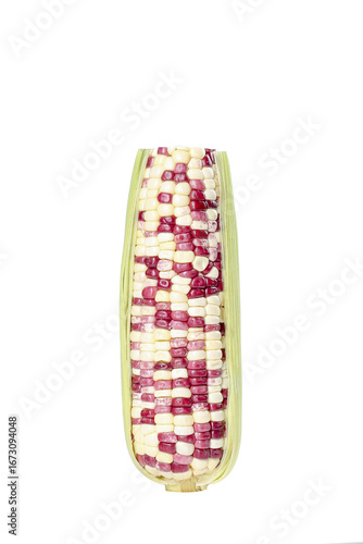 Colorful Indian Corn Cob with Purple White Yellow Kernels Isolated on White Background