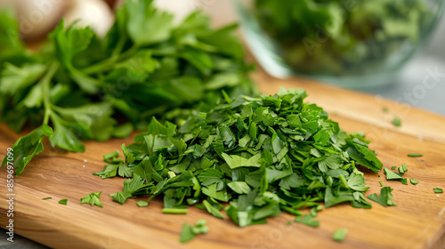 Colorful ingredients and finely chopped parsley are placed on a wooden board.