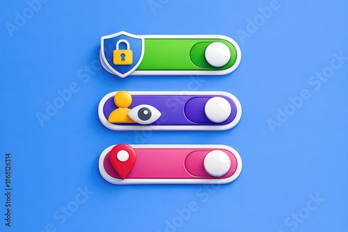 Colorful interactive toggle buttons representing digital security privacy location access and user engagement in a modern web interface showcasing vibrant graphic design principles