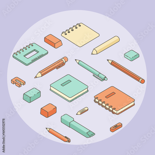 Colorful isometric stationery items arranged in a circle. Educational supplies in pastel colors displayed in an organized, circular layout on a lavender background.