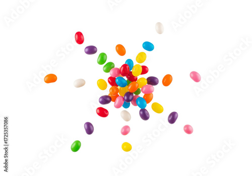 Colorful Jelly Beans Bursting and Scattered on White Background
