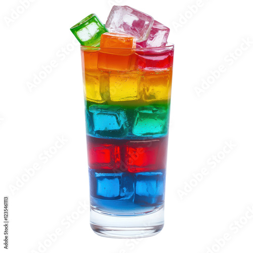 Colorful Layered Drink with Ice Cubes in a Clear Glass