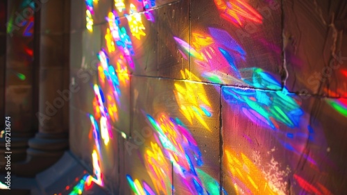 Colorful light reflections on brick wall creating vivid spectral patterns