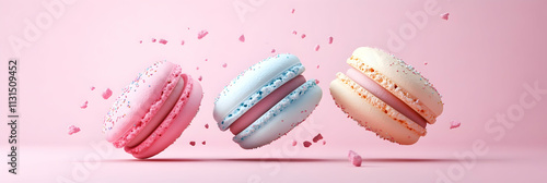 Colorful macarons in pink, blue, and yellow float playfully against a pastel backdrop