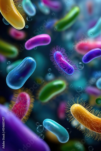 Colorful microbes and bacteria floating underwater in a vibrant microscopic world