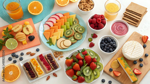 Colorful mixed food spread with fruits, snacks, desserts, drinks, and spices arranged neatly on a bright tabletop