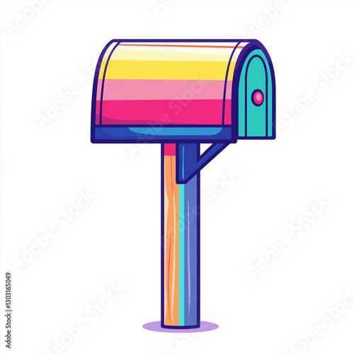 Colorful modern mailbox with a rainbow gradient design, mounted on a post, isolated on a white background