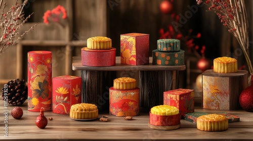 Colorful Mooncake Boxes and Decorative Elements for Celebration