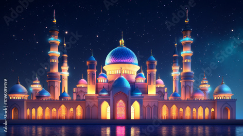 colorful mosque in night with light effect, Ramadan Kareem background with mosque with glowing neon lights, Mosque architecture building with neon lights glowing background.