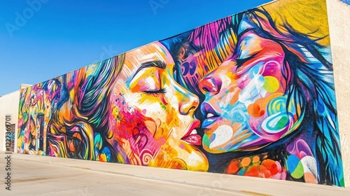 Colorful mural of two faces touching on a building wall under a clear blue sunny sky