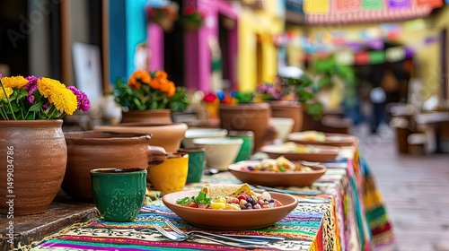 Colorful outdoor dining with vibrant food and flower decorations