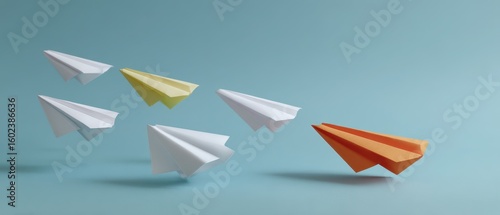 Colorful paper airplanes flying against blue background for creative design concepts