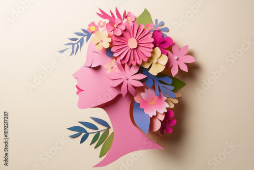 Colorful paper art depicting a woman's profile adorned with flowers