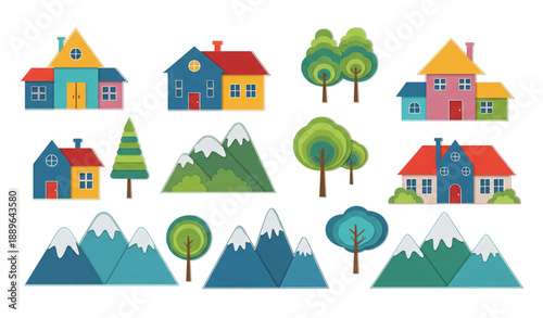 Colorful Paper Cut Style Houses Trees and Mountains Illustration Set
