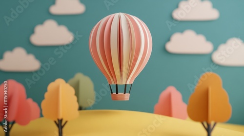 Colorful Paper Hot Air Balloon Floating Above Whimsical Landscape with Trees and Clouds in a Playful and Creative 3D Environment