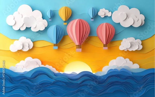 Colorful paper hot air balloons floating above waves with a bright sun setting behind clouds in a layered paper art style