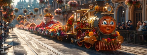 Colorful Parade Floats Gliding Through a Vibrant City Street During a Lively